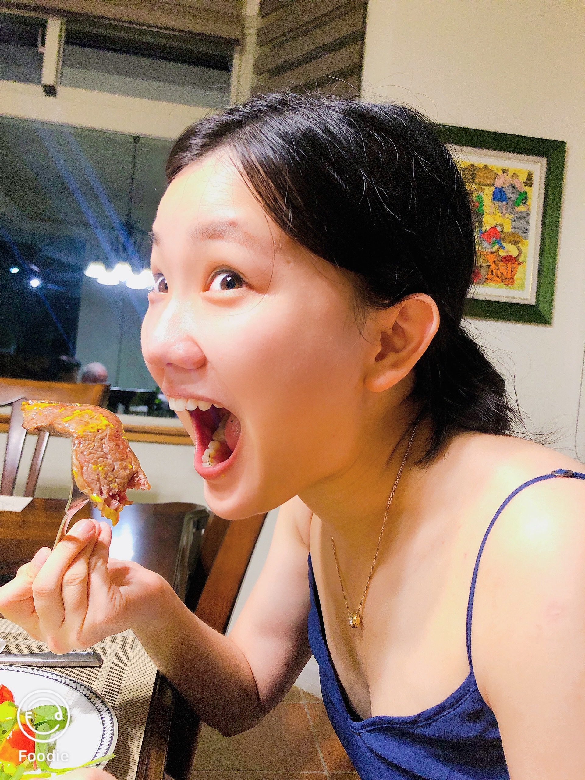 她用興奮到近乎扭曲的表情,用力咬下一大口牛排。