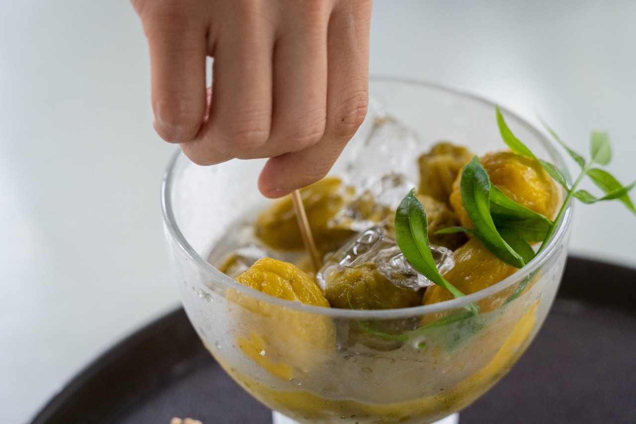 而紮實的是,過程雖只短短一小時,卻蘊含了不少工序,如殺青的過程裡,須反覆不停以手掌搓揉橄欖,藉由鹽巴破壞其表面活性,以去除澀味、增加爽脆口感。調味裝罐之後,也要將調味素材與橄欖充分搖勻直至出水,才能醃漬入味。