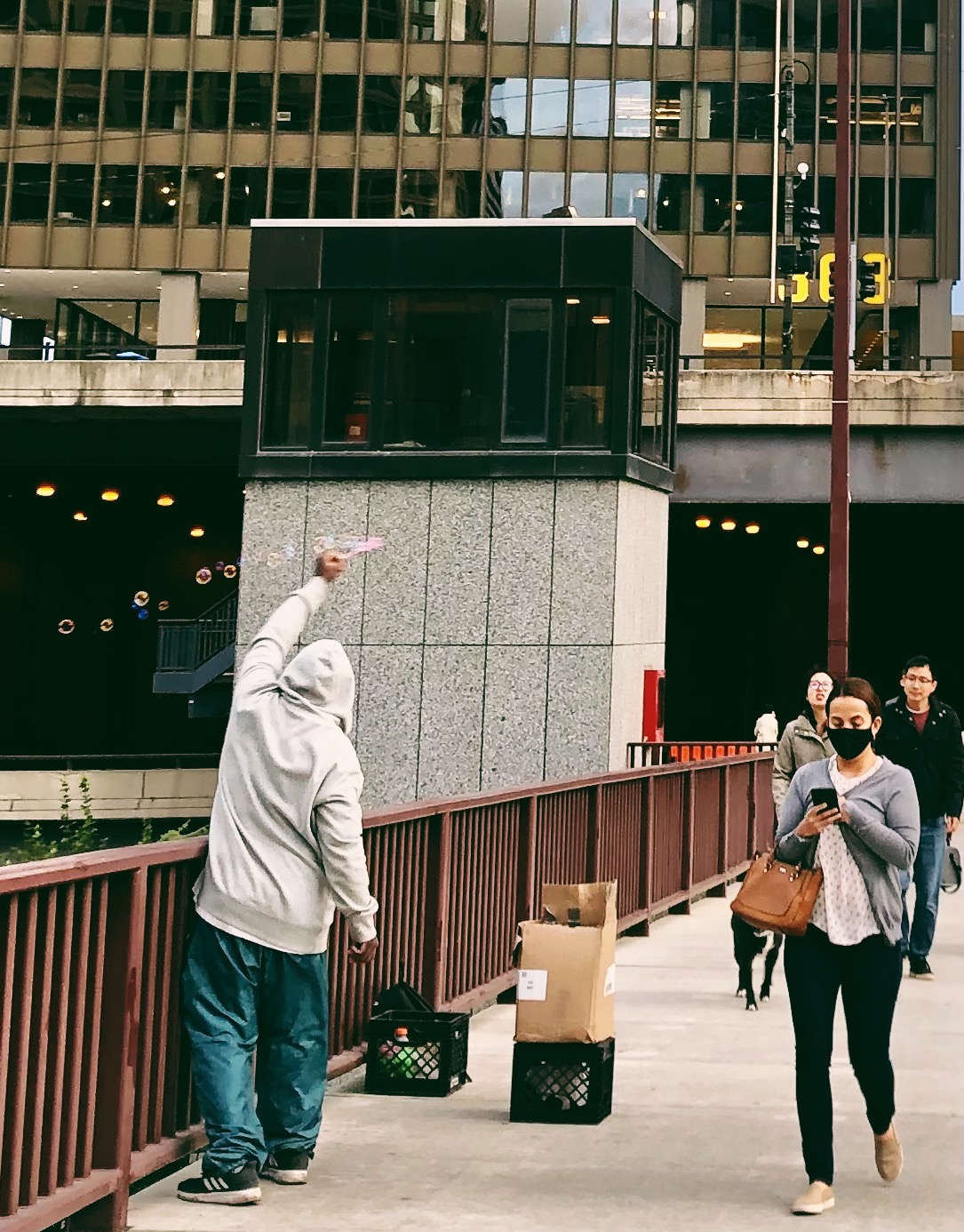 從早到晚,除了擺一塊牌子求施捨外,黑人大叔還特別喜歡做一件事,就是對著橋下吹泡泡。沒錯,是小時候我們玩過的那種吹泡泡。