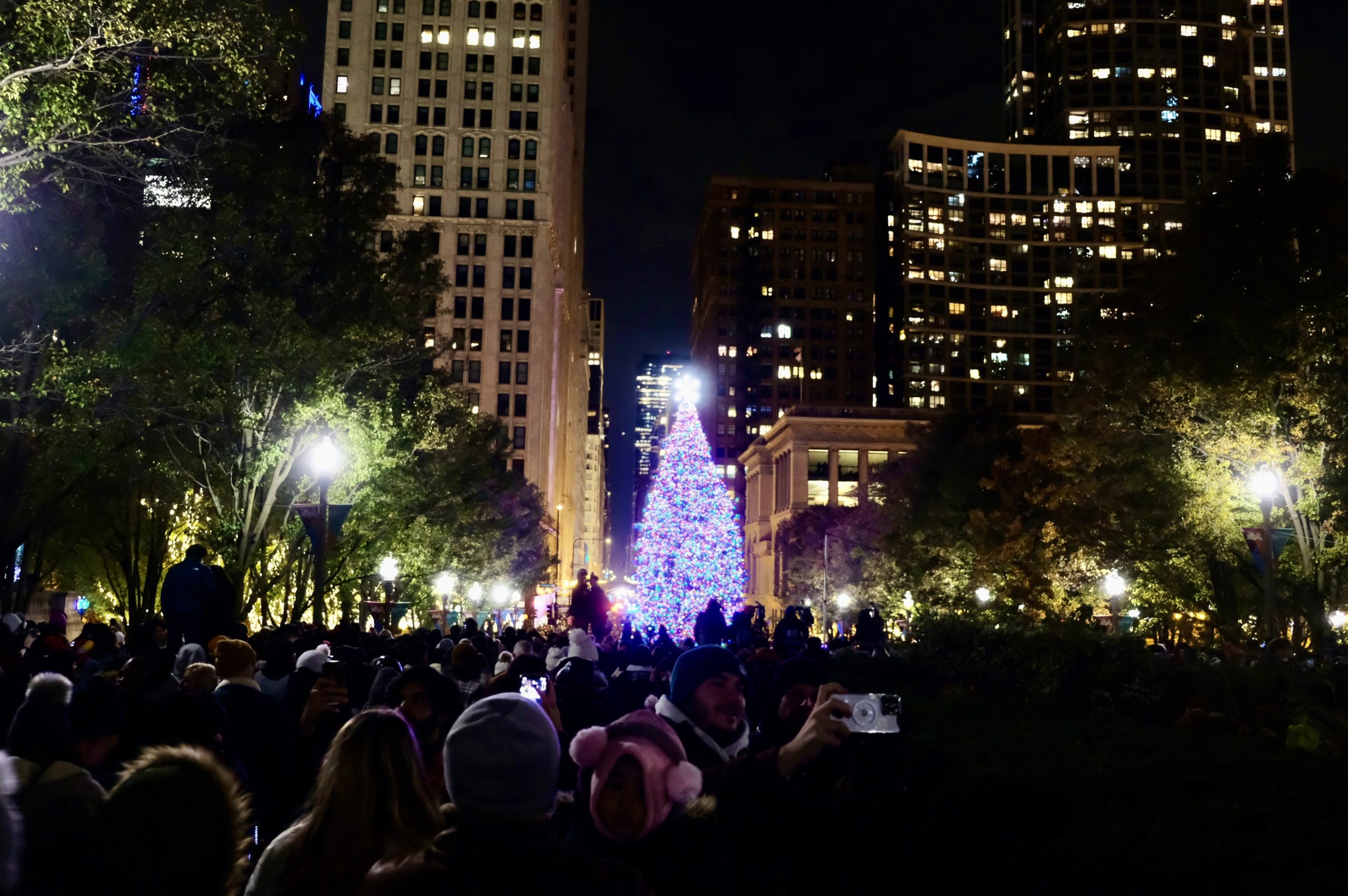 千禧公園的聖誕主樹點燈儀式,四周擠滿了人潮,盛況不下於跨年。在眾人的倒數聲中,高聳巨大的黑暗三角形被點亮了斑斕身影,全場歡聲雷動,歲末年終的序幕隨之揭開。