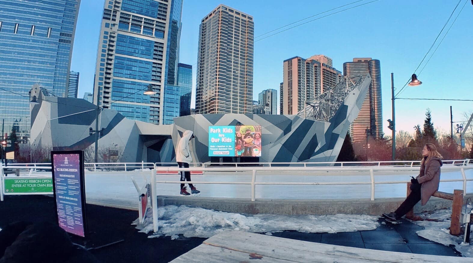 冬天轉瞬即逝,抓住尾巴刻不容緩。我們來到離家10分鐘路程的瑪姬戴利公園 (Maggie Daley Park) 戶外溜冰場。這個溜冰場不是常見的大片冰地,而是不規則的環型冰道,圍繞著戶外攀岩場,特殊設計深受芝加哥市民喜愛。