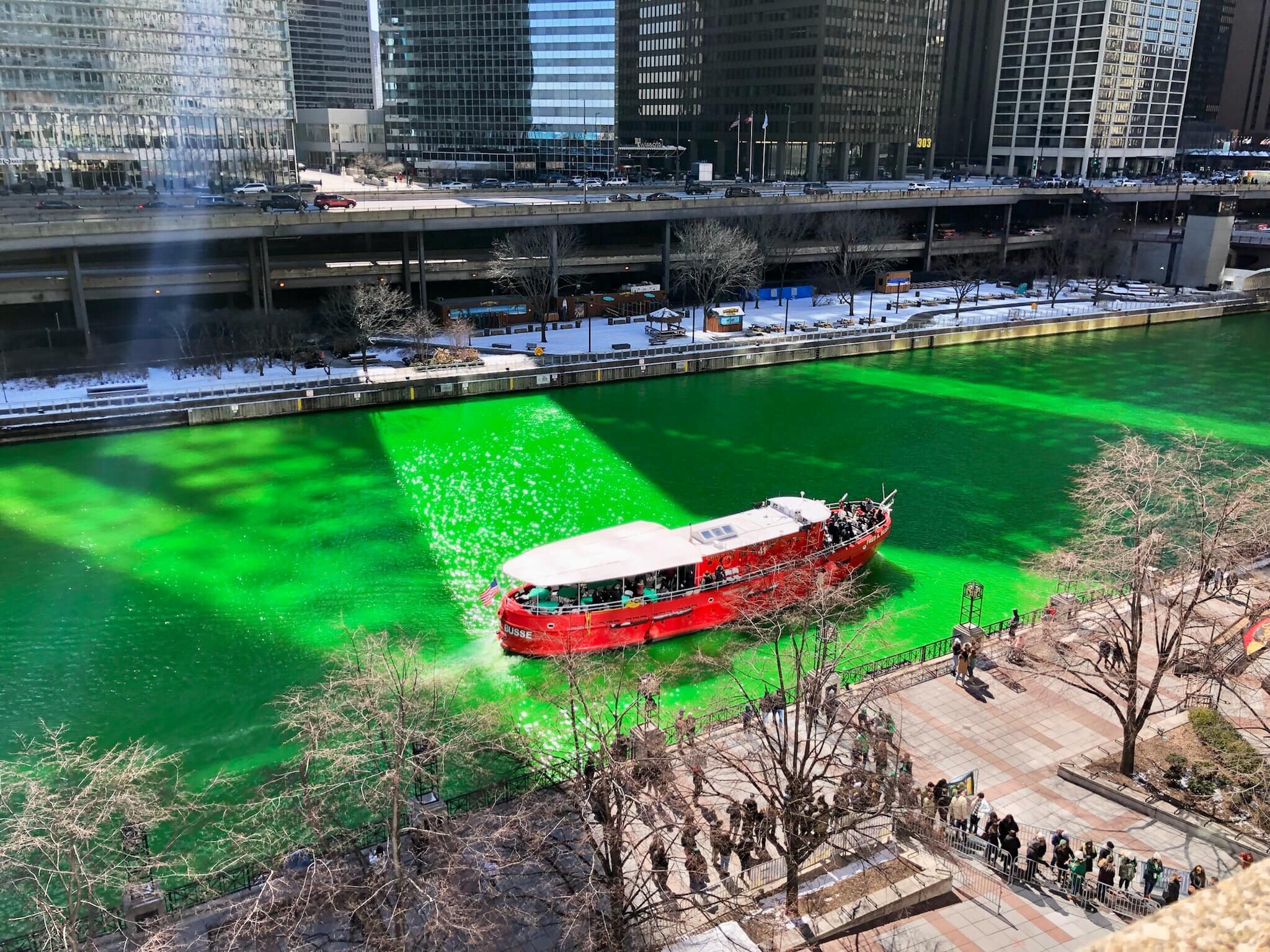 全美各地城市裡,處處可見綠色的佈景和人群,連啤酒都是綠色的。但要說到最綠的城市,沒有任何地方能跟浮誇的芝加哥比—它們把整條河都染綠了!