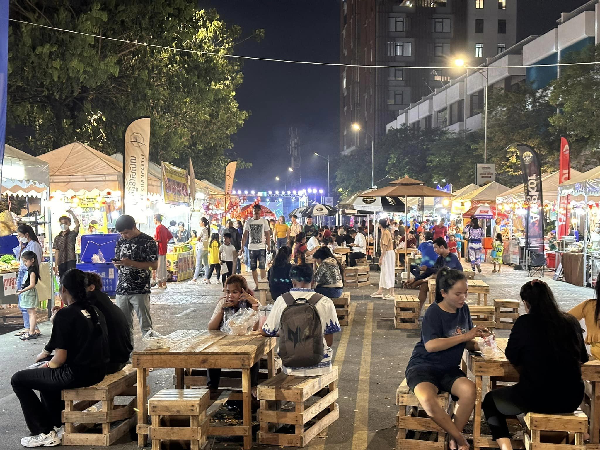 叫的嘟嘟車在前來的路上,陷入因封街而打結的車陣裡,100公尺距離足足騎了20分鐘,這段時間,乾脆慢下腳步跟著民眾逛市集。好多家庭帶著老小出門,大人在露天座椅上吃飯聊天,小孩扛著水槍四處跑,家家戶戶都有兩三個。告別農村大家庭,新型態的都市中小型家庭正在這個城市興起,也許,這就是像我小時候台灣的光景吧。