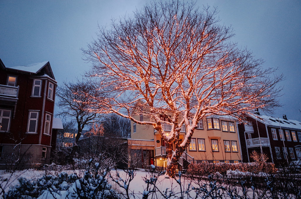 美麗的雪景、稀少的人煙、北歐風格的平房,沒有高樓大廈,但有一顆如夢似幻的聖誕燈飾樹,在遲來的北國晨曦中散發璀璨的光芒,冰島在我眼前揭開了神秘的面紗。