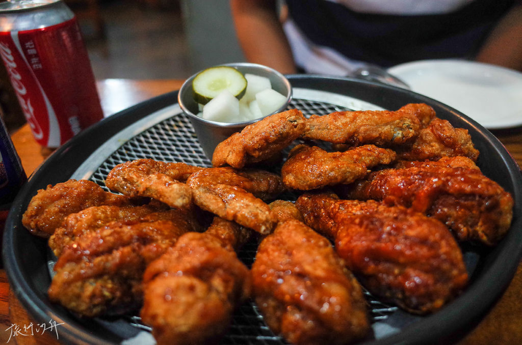 我和同事信步走進去,才發現是韓國連鎖炸雞名店 “BonChon”。此店發跡於韓國,卻發揚於美國。相較於美式炸雞的粗曠豪邁,韓式炸雞更顯細膩講究,肉質滑嫩且富含肉汁,表皮脆而不硬,美妙地包裹在蒜味醬燒或韓式辣醬兩種獨家調味料裡,是深夜食堂界的霸主,更是引誘你非得開瓶啤酒下菜的惡魔。